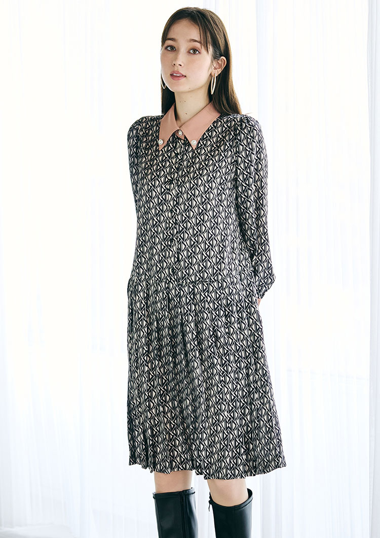 ―総柄ワンピは1枚で着られる時期に存分に楽しみたい!ロングブーツを合わせれば秋のデートコーデの完成。