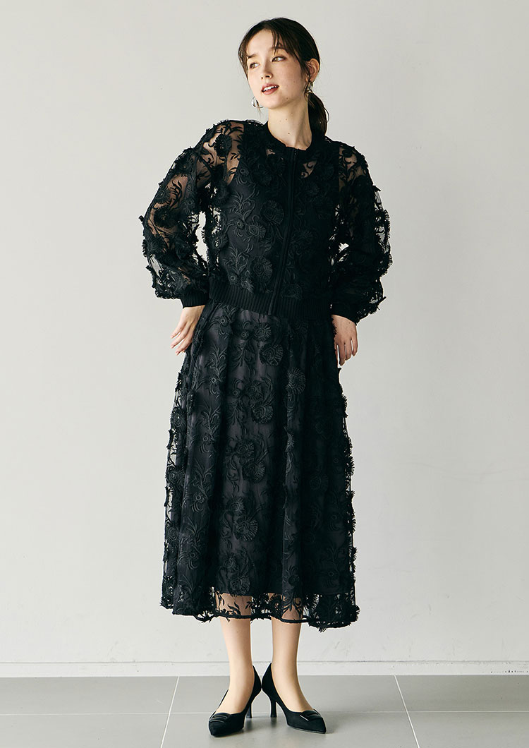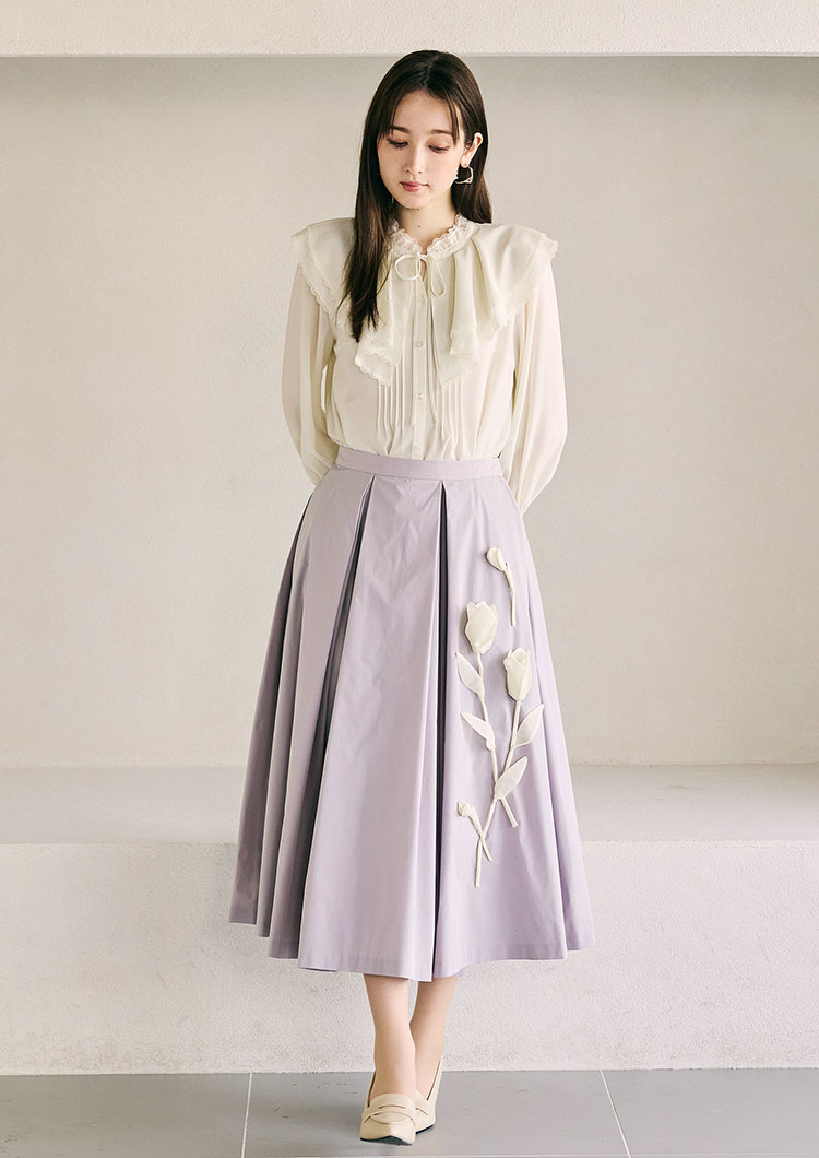 ―可憐に魅せたい日はブラウス×スカートのお嬢様スタイルで。スカートのフラワーモチーフが存在感たっぷりで飽きさせません。