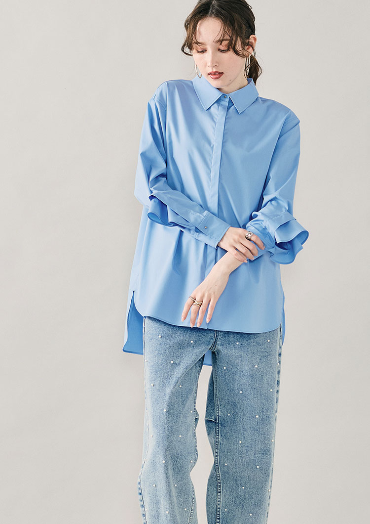―ブルーのシャツで日差しのある日中も爽やかに。袖のフリルやデニムのパールで甘さをひとさじ。