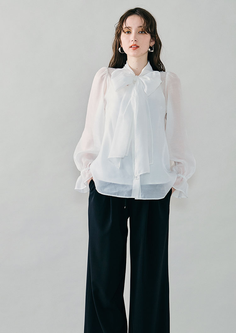 ―大きなリボンタイブラウスをリラクシーな雰囲気で。ゆったり気負わない雰囲気がお洒落上級者見え。
