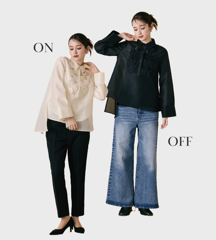 上品な素材感と、胸元のフラワーモチーフが上品かつラグジュアリーな印象に導く襟付きブラウス。