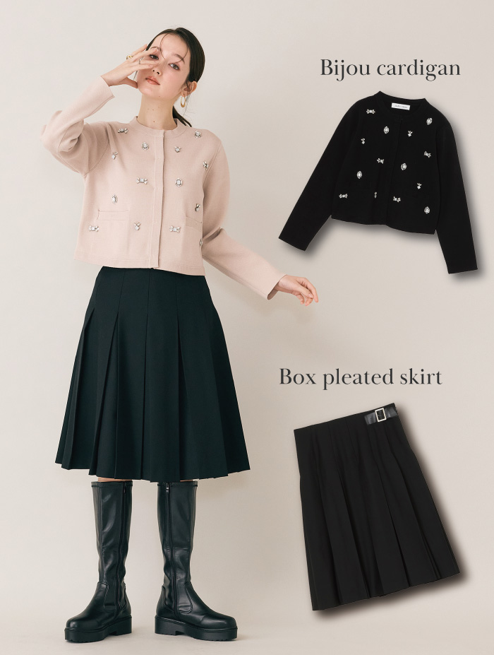 ボックスプリーツのかかったスカートはトラッドな雰囲気を醸し出し、きちんと見えが叶うスタイリングです。