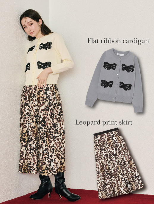 配色デザインのリボンがついたカーディガンと、インパクト抜群なスカートの組み合わせ。