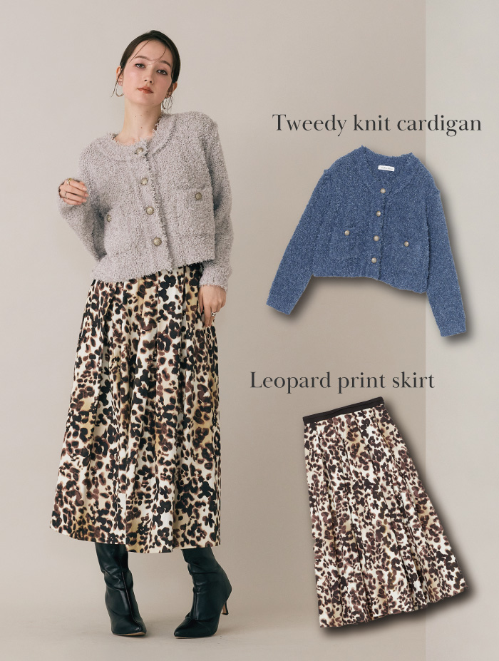 上品なふわっとしたツイードカーデと、印象的なスカートを合わせた大人のお姉さんスタイル。
