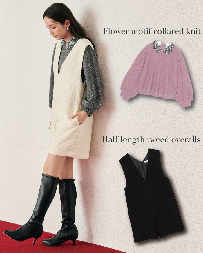 スパンコールのキラキラとツイードの表面感がシーズンムードを高めるスタイリングです。