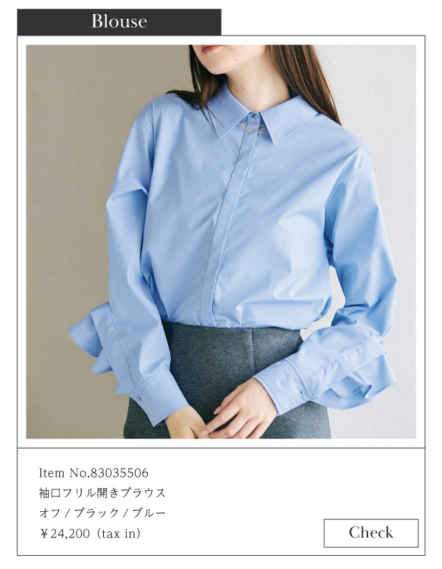 極力シンプルになるように仕上げたシャープさと、袖口のフリルのフェミニンモード感が他では味わえない1枚です。
