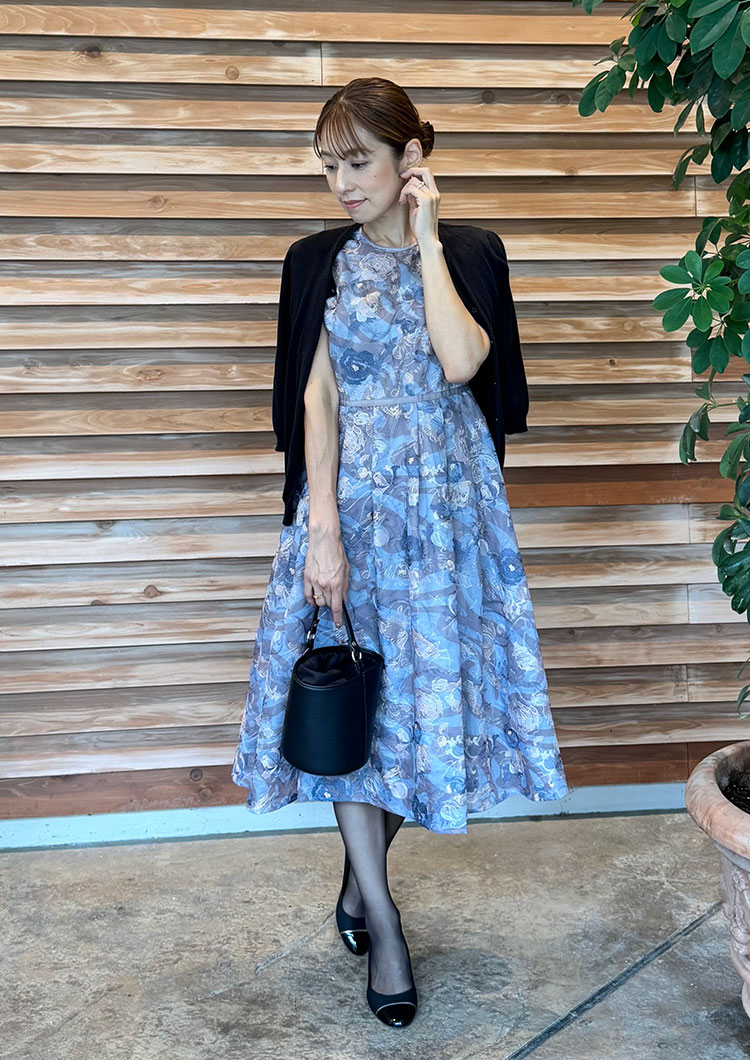 プリントと刺繍が映えるワンピースは纏うだけで品よく華やかに。