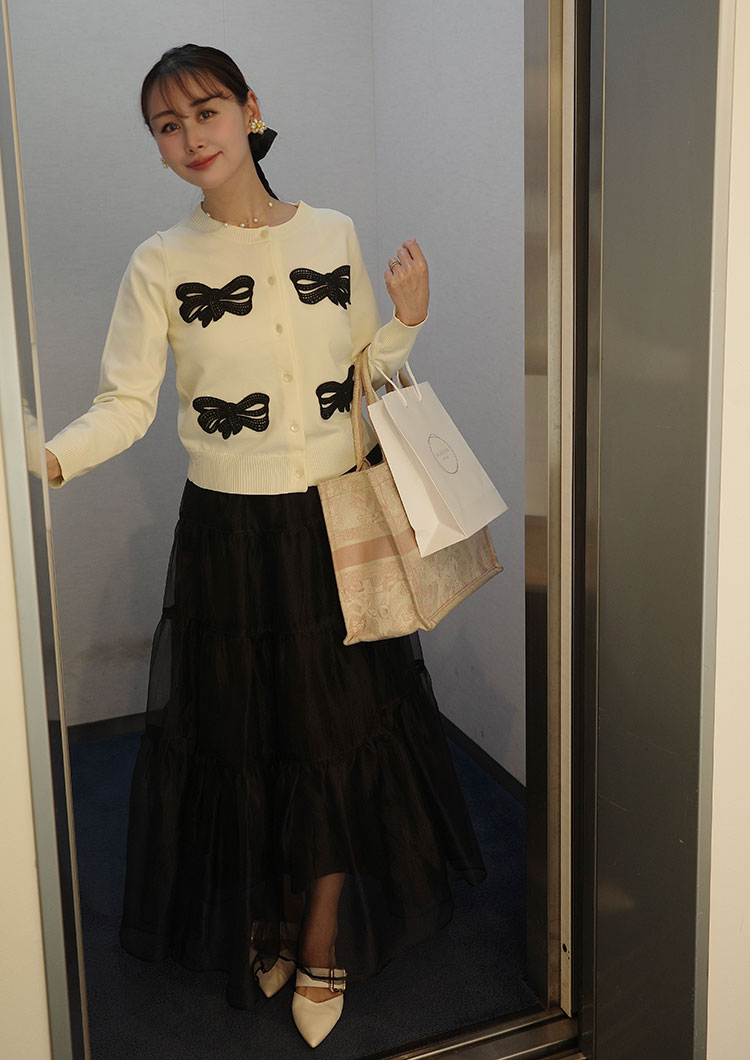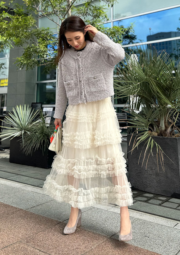 着丈がコンパクトなカーディガンは、ボリュームのあるスカートとも好相性!