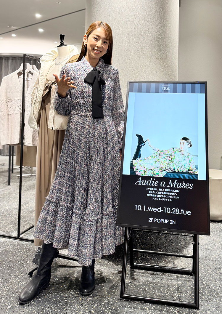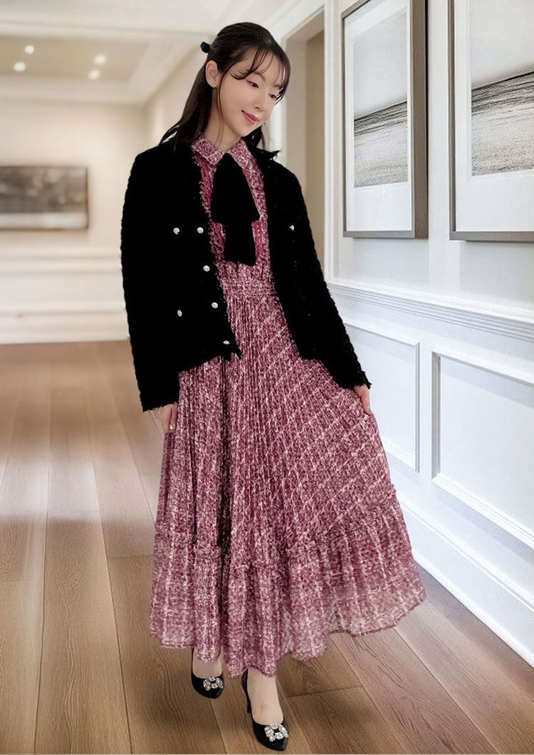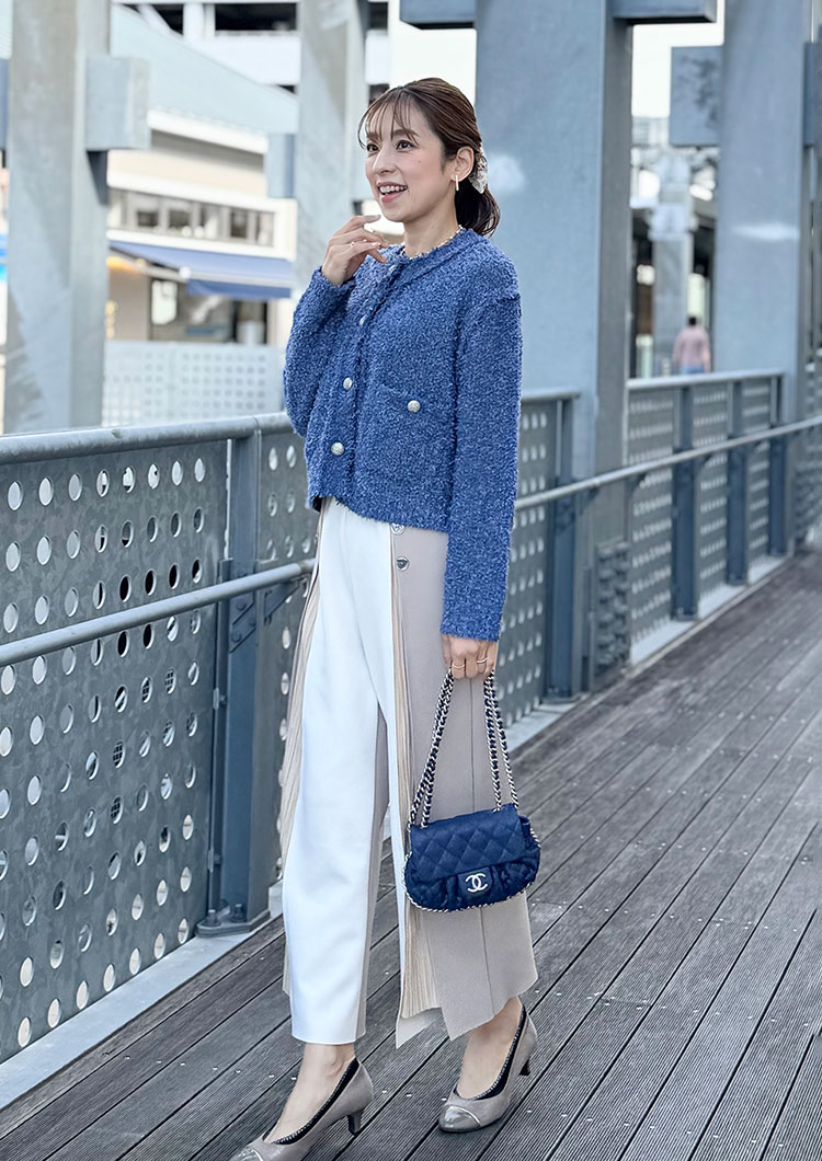 ツィードプリントのワンピースにリアルツイードのジャケットを合わせた華やかコーデ。