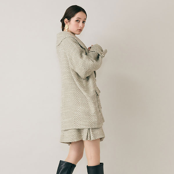 同素材のミニスカートとのセットアップスタイルがおすすめです。