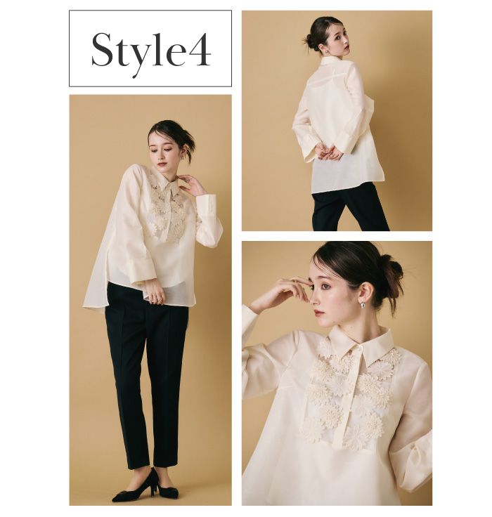 透け感のあるシャツはきちんと見えが叶い、フォーマルなシーンでも着られるスタイリング。