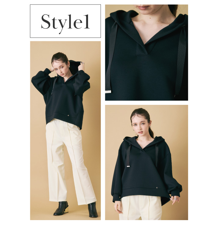 パーカーは首元をざっくりと開け、抜け感を演出しました。
