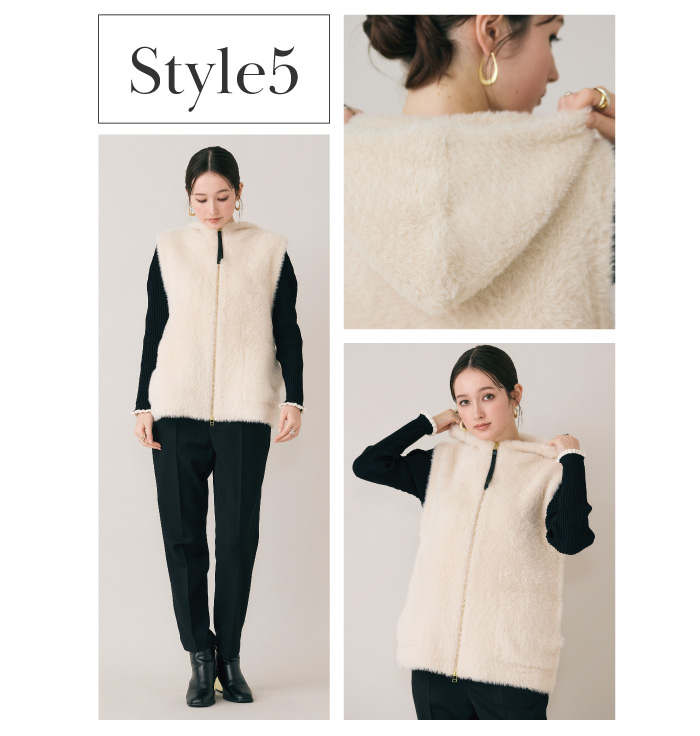 ふわふわのシャギーベストが遊び心を加えてくれるスタイリング。