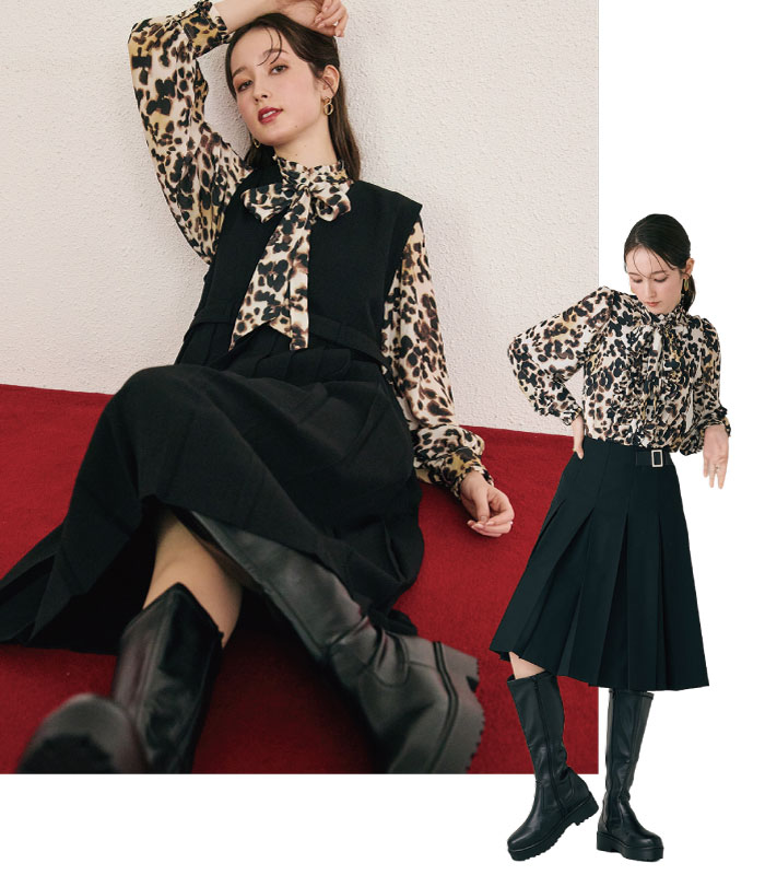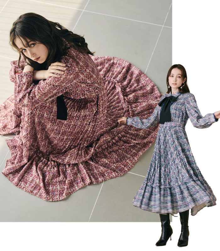 胸元のリボンタイが甘さをひとさじ加えてくれ、クラシカルさと今っぽさを兼ね備えた1着です。