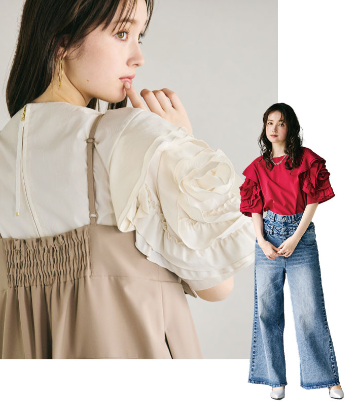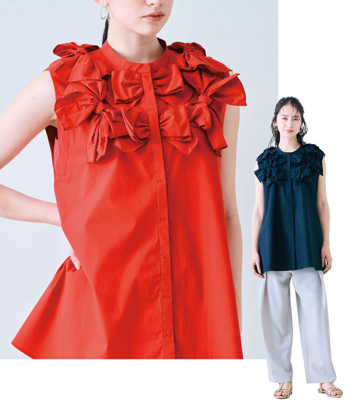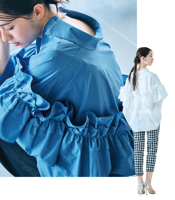 クリーンできちんと見えするシャツに大胆なフリルをつけたブラウスも人気でした。