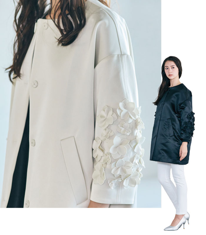袖についた大小さまざまなフラワーモチーフが特別感たっぷりなコクーンジャケット。