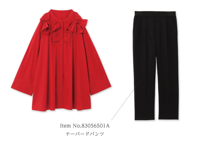 シンプルなテーパードパンツを合わせればリボンブラウスも甘すぎない。