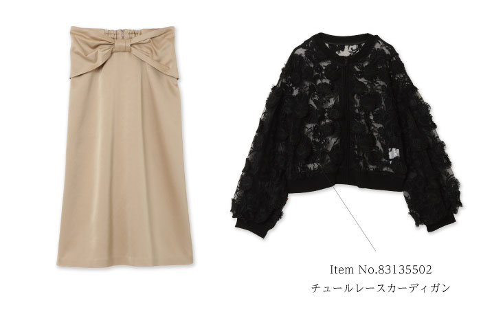 ベージュのスカートは光沢感が際立って、より華やか見え。