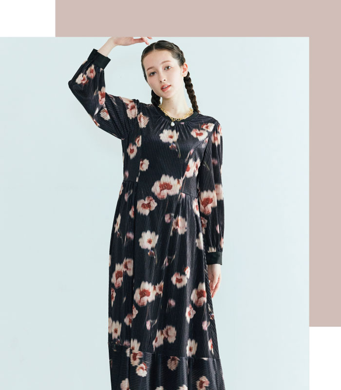 ベロアの光沢感が深みを出してくれ、リッチな印象のプリントワンピース。