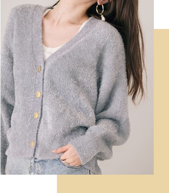 キラキラ光るラメ糸を織り交ぜた人気の華やかカーディガン。