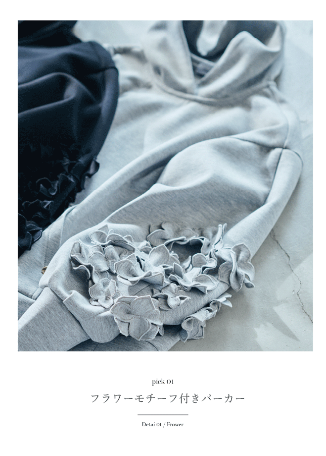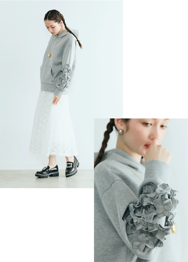 立体的なフラワーモチーフが映える、ラグジュアリーなパーカー。カジュアルな定番スタイルに華やぎと奥行きを添え、日常に溶け込むモード感を演出します。