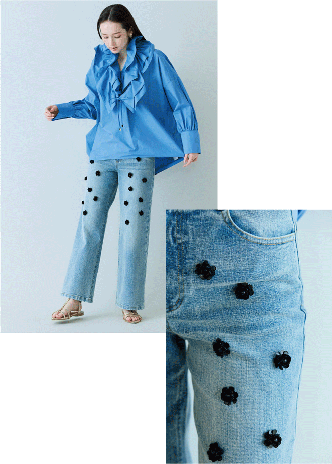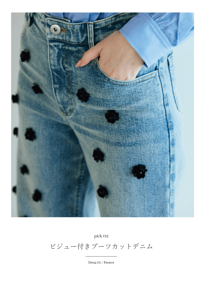 見慣れたデニムも、ビジュー使いで新鮮に。ブラックのフラワーモチーフが甘さを抑え、モードな印象に仕上げたブーツカットデニム。美しいシルエットで、きれいめスタイルにも自然に馴染む一本です。