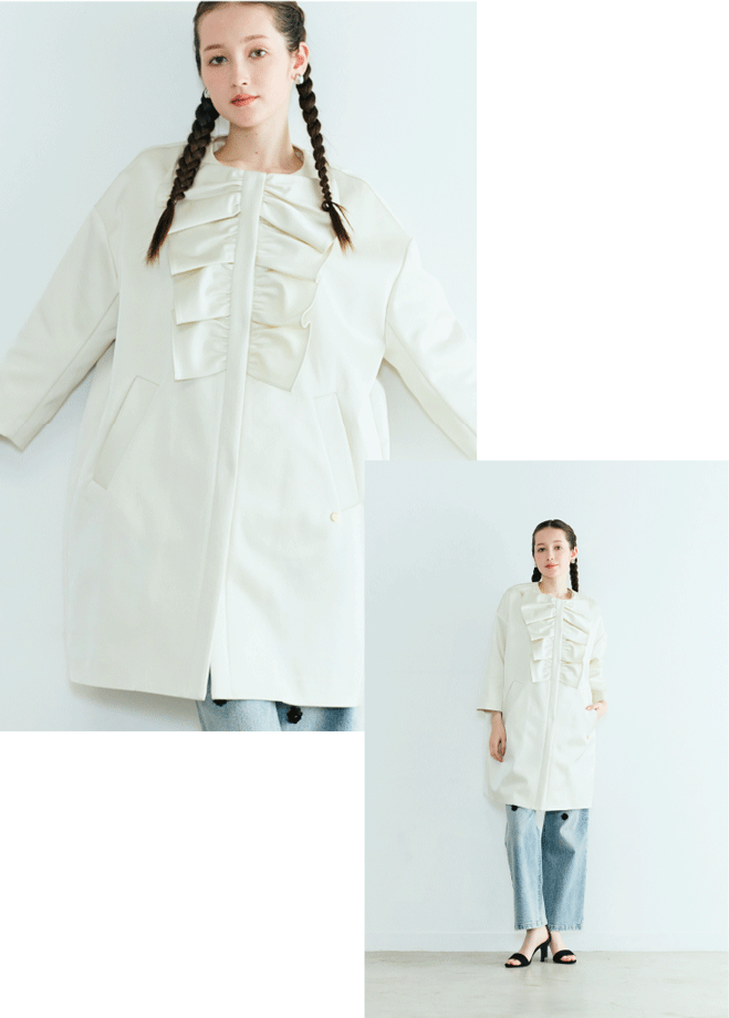 フリルの陰影と微光沢のサテン素材、柔らかなコクーンシルエットが春の装いを上品に引き立てます。