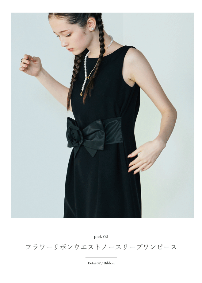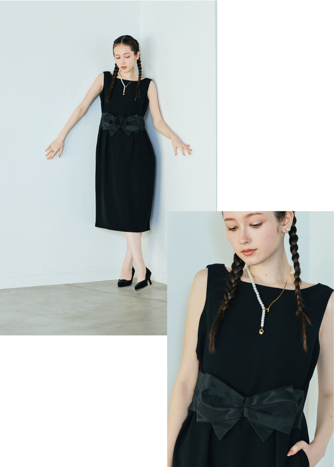 ウエストの立体リボンとフラワーモチーフが印象を刻むリトルブラックドレス。シンプルだからこそ際立つ立体ディテールが美しく、装いに品のある華やぎと視線を添える一着です。