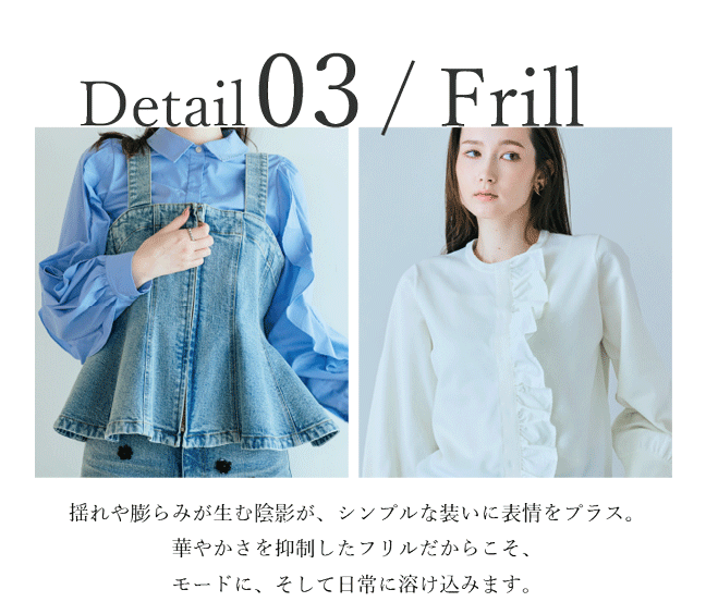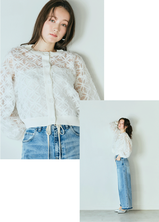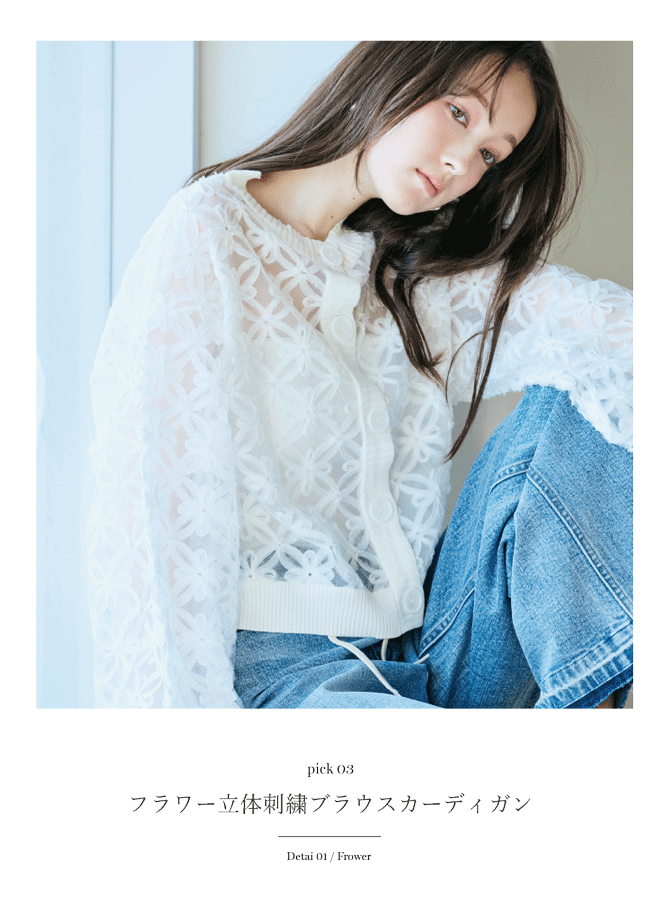 平面的な装いに、奥行きと存在感を。刺繍やモチーフが生む立体ディテールが、シンプルなスタイルをモードに更新します。大人の装いに静かな華やぎを添える一着です。