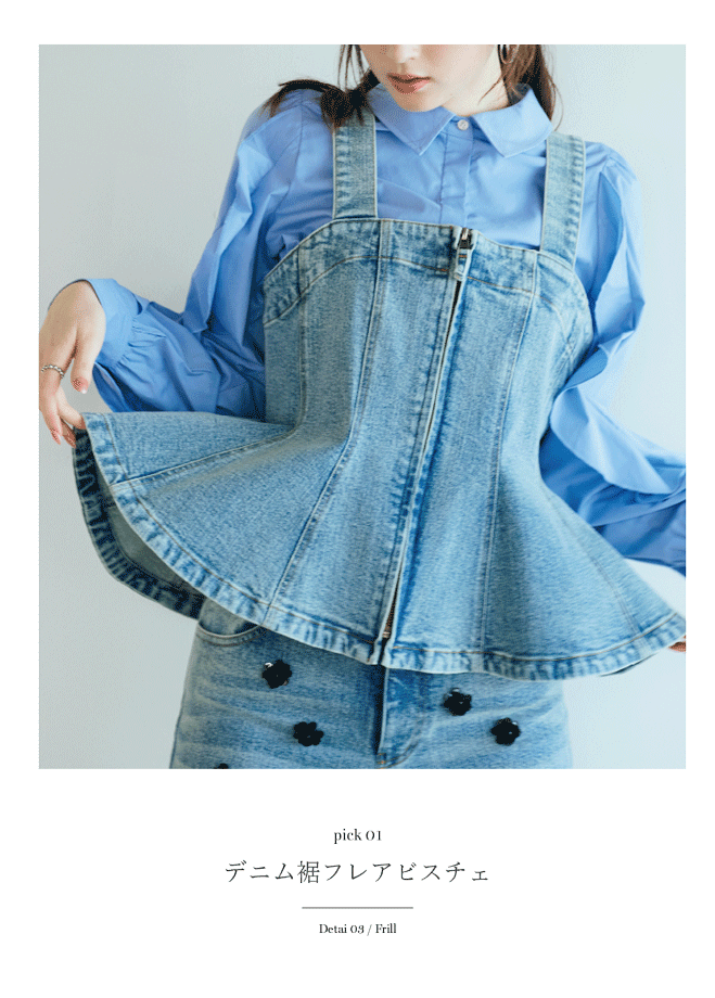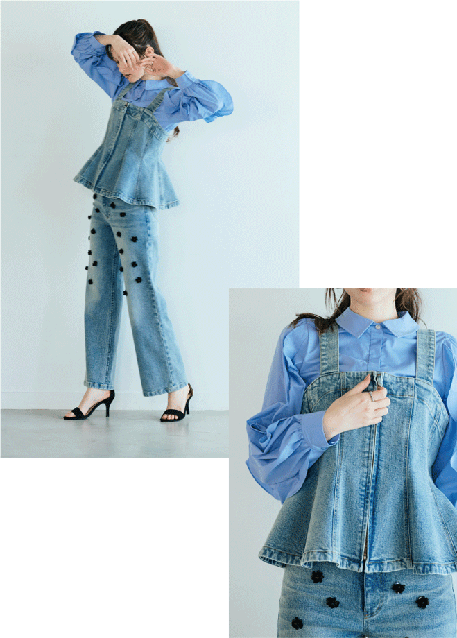 縦の切替と裾フレアが描く立体シルエットで、デニムをフェミニンに昇華。ウエスト位置を高く見せる設計と、レイヤードで表情が変わるビスチェは、いつものスタイルを新鮮に更新します。