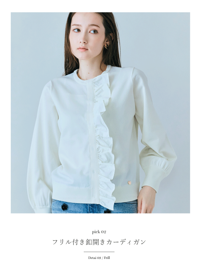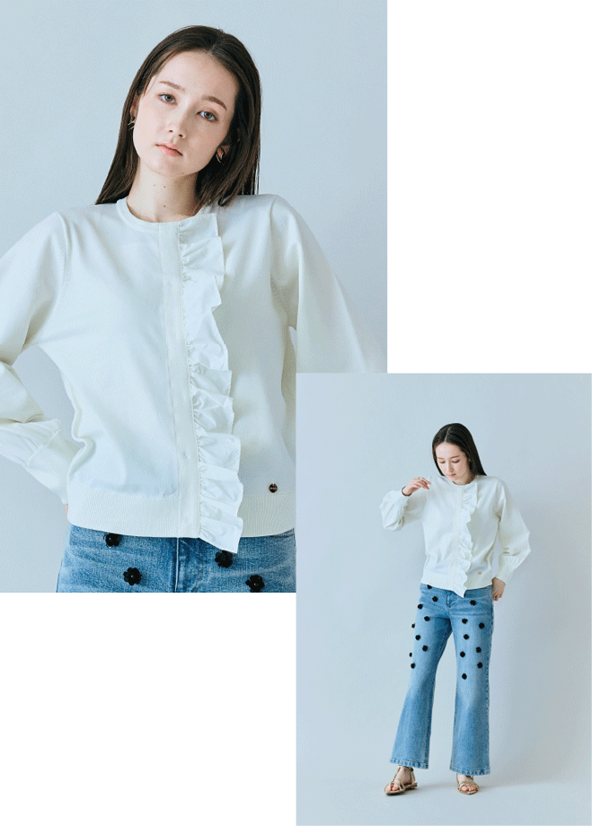 フロントにあしらった立体フリルが、シンプルなニットに表情をプラス。ブルゾン風シルエットと幅広フリル、グログラン使いが甘さを抑え、きちんと感のある大人の華やぎを演出します。