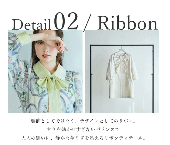 胸元に配した立体的なリボンが、装いに奥行きと視線のポイントをプラス。甘さを抑えたデザインで、シンプルなスタイルもモードに更新します。さりげない存在感が、大人の装いに品のある華やぎを添える一着です。