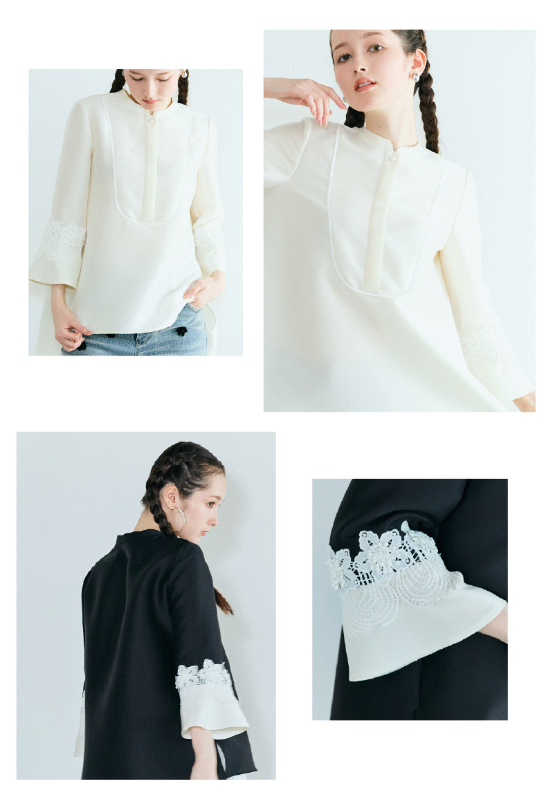 クリーンなブラウスに、レースを効かせたデコラティブな袖が映えるブラウス。