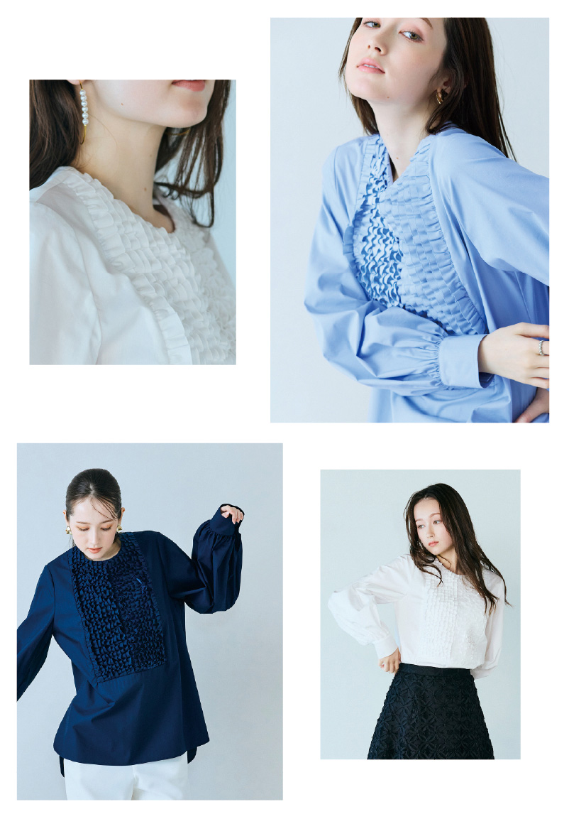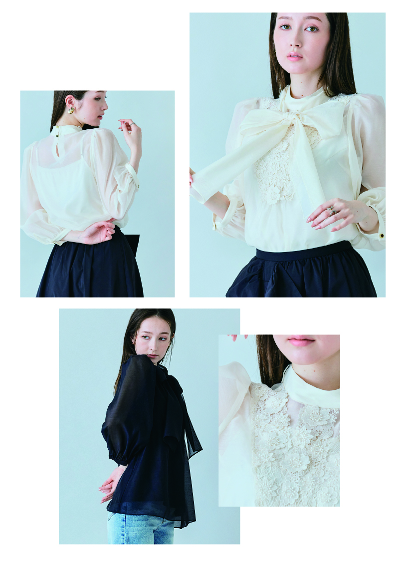 取り外し可能なリボンタイで表情を変えられ、甘さを調整できるのも魅力。一枚で着映えし、装いにやさしい女性らしさを添えてくれます。