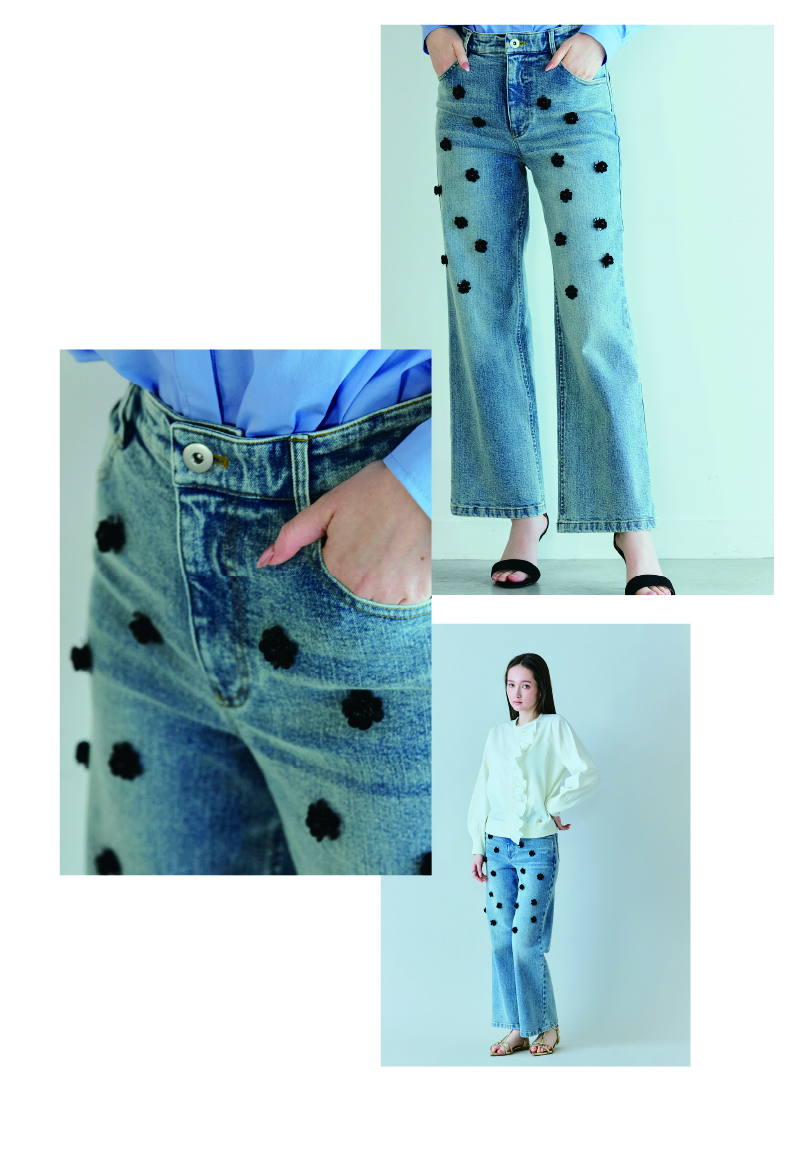 見慣れたデニムも、ビジュー使いで新鮮に。ブラックのフラワーモチーフが甘さを抑え、モードな印象に仕上げたブーツカットデニム。美しいシルエットで、きれいめスタイルにも自然に馴染む一本です。