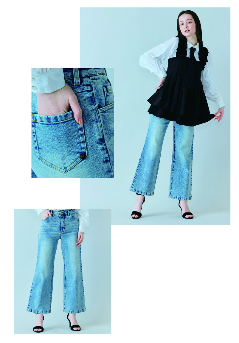 縦の切替と裾フレアが描く立体シルエットで、デニムをフェミニンに昇華。ウエスト位置を高く見せる設計と、レイヤードで表情が変わるビスチェは、いつものスタイルを新鮮に更新します。