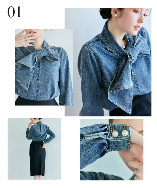 「デニムを、もっときれいに。」 軽やかなデニム素材に洗いをかけた、抜け感のあるリボンタイブラウス。配色ステッチがほどよいアクセントになり、カジュアルすぎない大人の表情に仕上がります。スカートでフェミニンに、パンツでハンサムに――合わせ次第で表情が変わる、季節をつなぐ万能トップス。