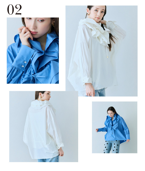 「アクセサリー要らずの主役ブラウス。」 ギャザーモチーフのネックレスが視線を集める、今年らしいオーバーシャツ。タイプライター素材のハリ感がシルエットを美しく描き、スキッパー衿で顔まわりはすっきり。パンツにさらりと合わせるだけでコーデが完成するから、忙しい朝の心強い味方に。きれいめもカジュアルも一枚で決まります。