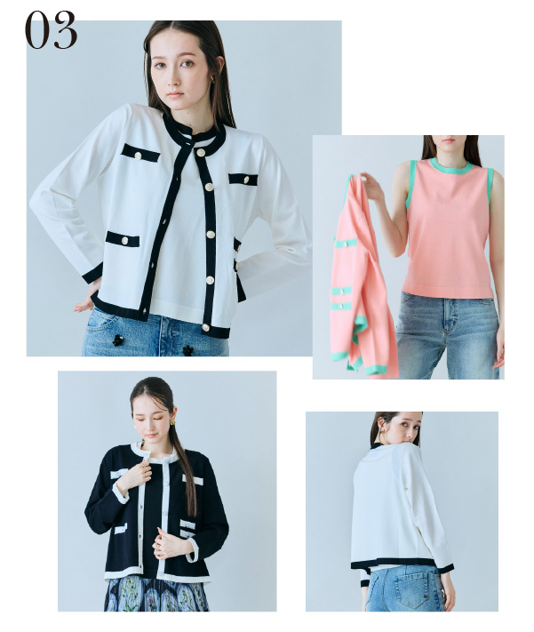 「一枚で品格、重ねてモード。」 配色パイピングとメタルボタンがきらめくニットアンサンブルは、シンプルなのに印象的。カーディガン×インナーのセット使いはもちろん、単品でも着回せる頼もしさが魅力です。フラットな編地で身体のラインをきれいに見せ、オンの日は端正に、オフの日はデニム合わせで軽やかに。迷わず手に取れる“きれいのベース”になる一着。