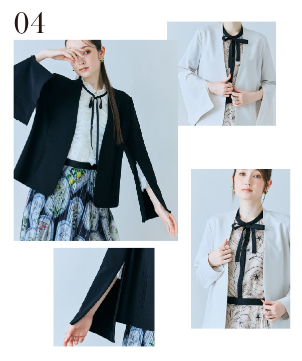 「甘さは、モードにまとう。」 大ぶりのダブルリボンが印象的な一枚仕立てジャケット。顔まわりを華やかに彩りつつ、ドロップショルダーとボリューム袖でこなれ感のあるシルエットに。前後差のある着丈が腰回りをさりげなくカバーし、パンツにもスカートにも好バランス。特別な日も日常も任せたい、主役級の羽織りです。
