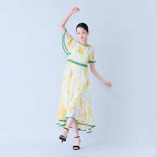 ミモザプリントが華やかに映えるワンピース。裾に向けて広がるフレアシルエットがドラマティックな存在感を演出します。無地の切り替えが全体を引き締め、凛とした印象に仕上げた一枚。