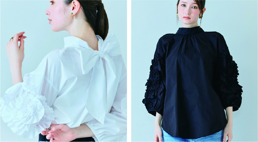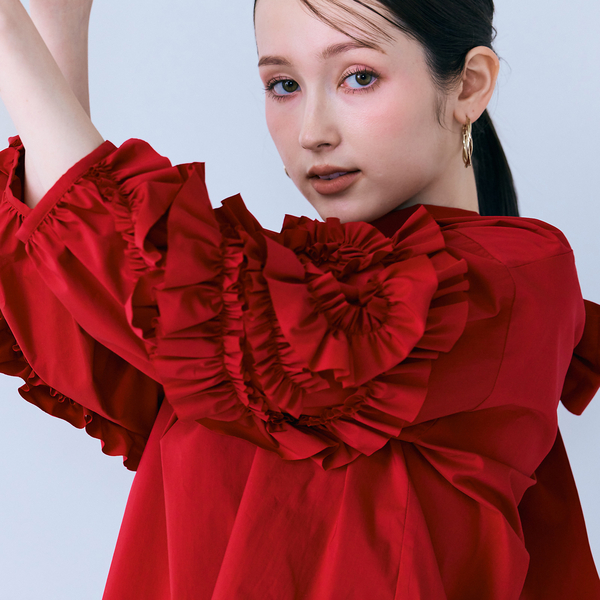 クラシカルなエッセンスをモダンに昇華したフリルブラウス。袖の繊細なフリルが立体感を生み、スタンドカラーとバックリボンが凛とした印象に。一枚で主役になる存在感のあるデザインです。