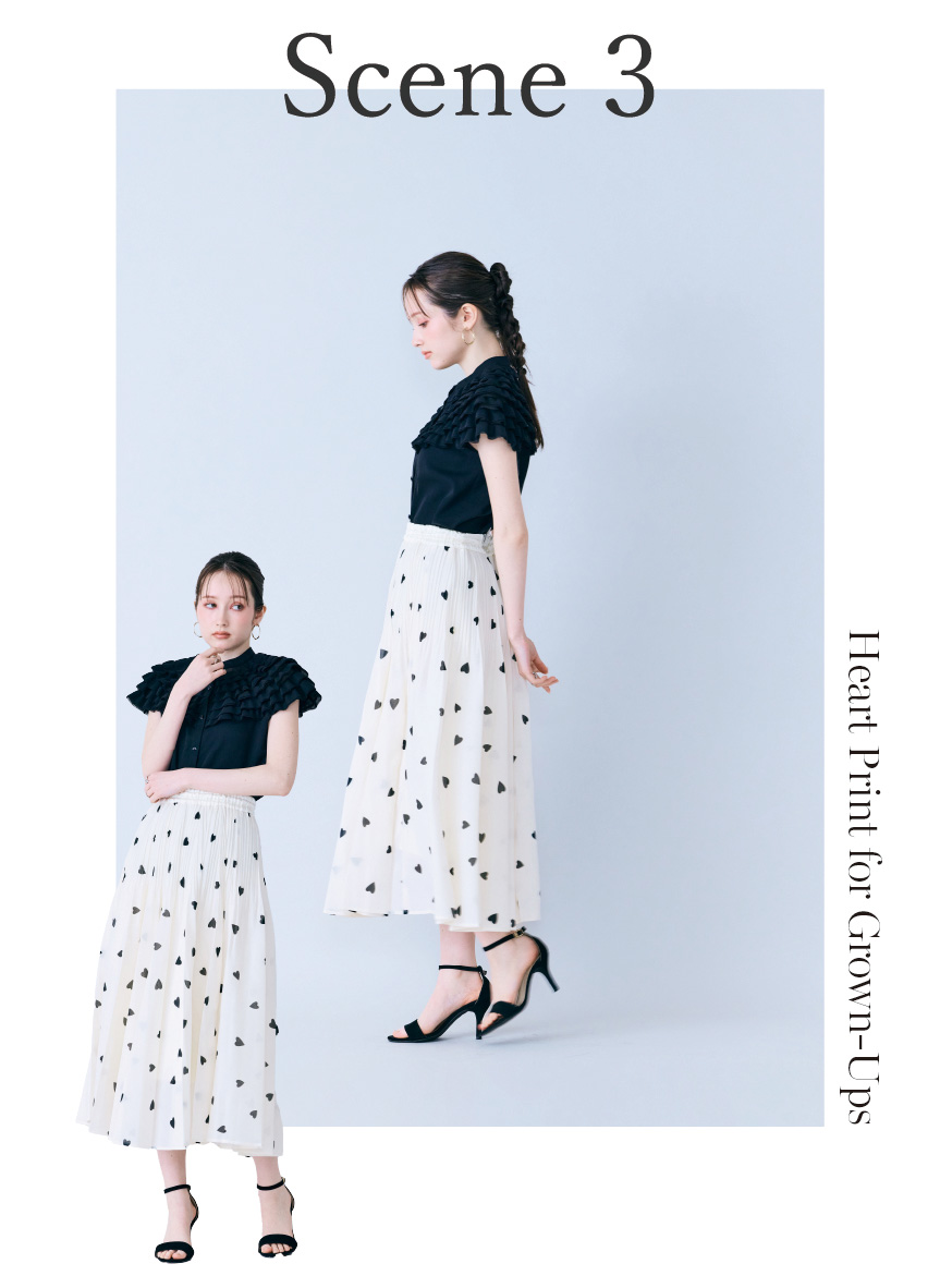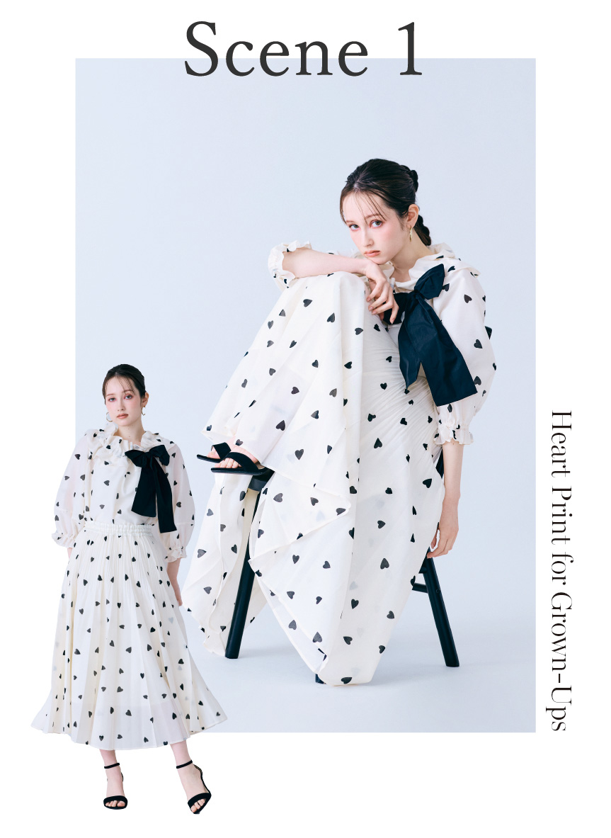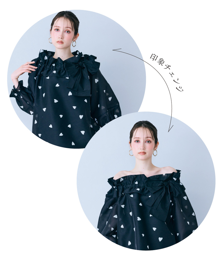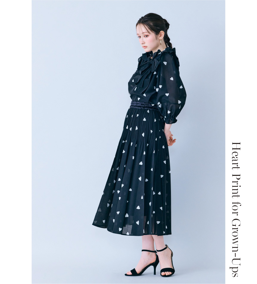 甘さのあるハートプリントを、ブラウスとスカートのセットアップでエレガントに。ブラックのリボンがアクセントとなり、フェミニンな中にも大人らしい引き締まった印象を演出します。デートやお出かけにぴったりのスタイリングが時短で叶います♡
