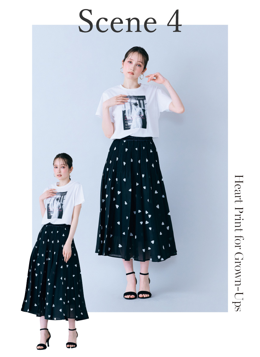 ロゴTシャツと合わせた、リラックス感のあるカジュアルスタイル。フェミニンなハートプリントスカートも、カジュアルアイテムと組み合わせることで程よく力の抜けたスタイリングに。足元は華奢なサンダルで女性らしさを残しつつ、大人のデイリースタイルとして楽しめる着こなしです。
