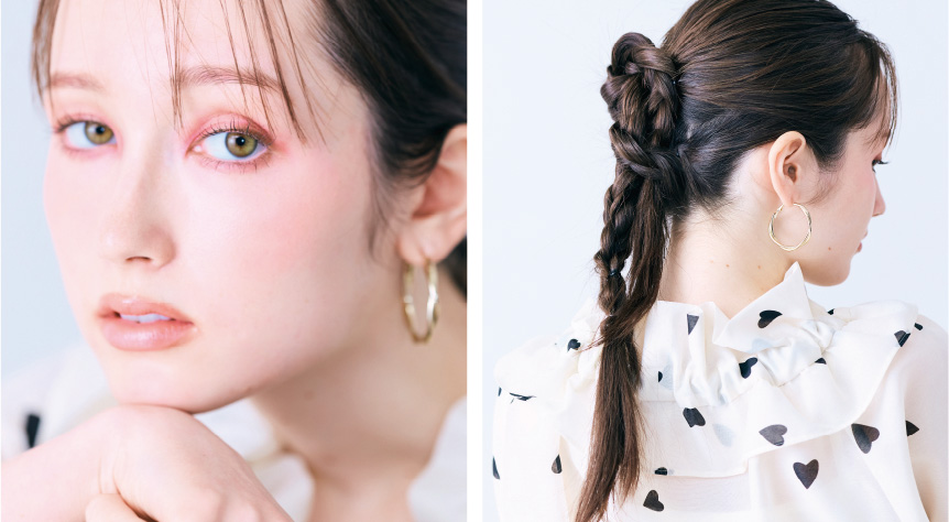 ヘアはタイトにまとめたアレンジポニーテールで、顔まわりをすっきりと見せたバランスに。メイクはピンク~ベージュを基調にした透明感のあるフェミニンな仕上がりで、ハートプリントのやさしい雰囲気を引き立てて。甘さと上品さがほどよく調和した、大人に似合うハートプリントスタイルの完成。