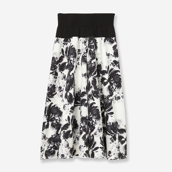 たっぷり分量を取った贅沢なフレアシルエットながらも、品の良い水彩タッチの花柄がエレガントなムードを演出します。