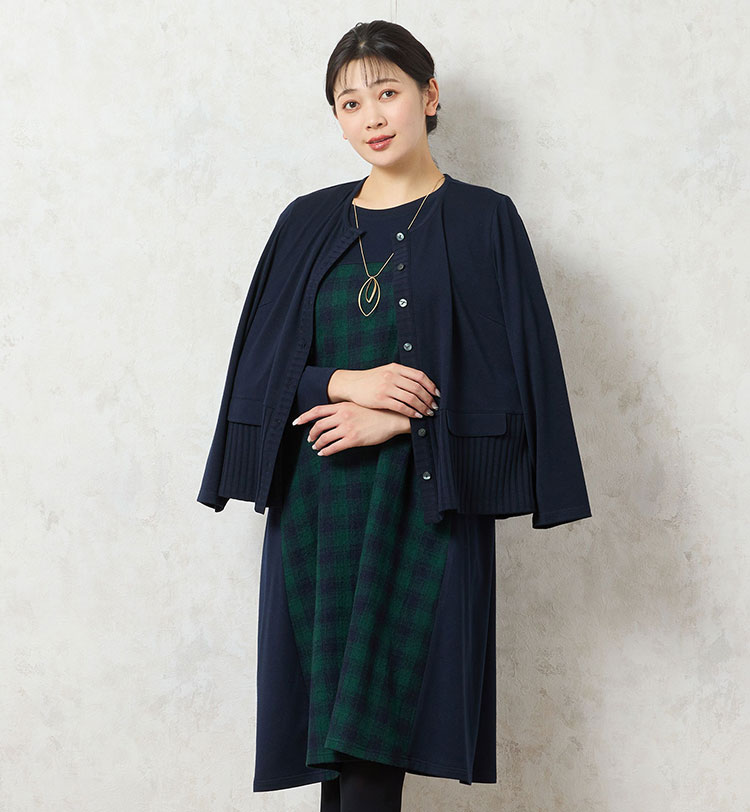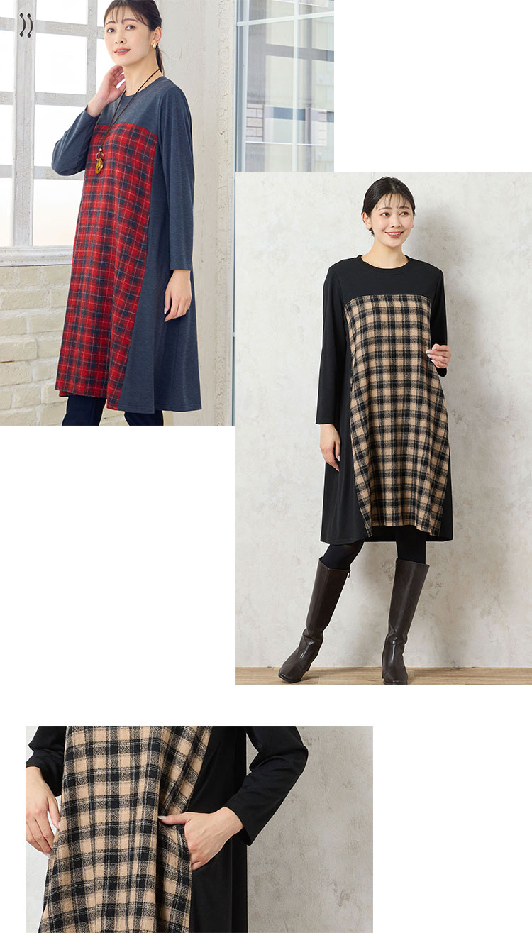こちらはワンピース。前身にウール素材を使用しており、サイドや袖を無地にすることでスッキリと着られる嬉しいデザインです。