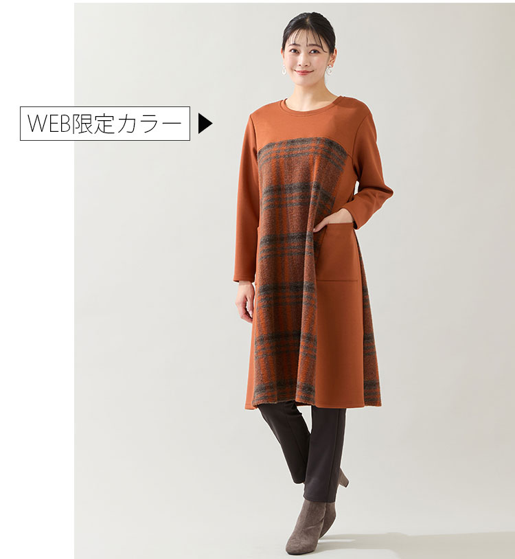 10月中旬入荷予定のワンピースがこちら!空気をたっぷり含んだスライバーのチェック柄を使用しており、脇の無地使いで着やせ効果は◎これから寒くなる季節にピッタリの温もり感たっぷりの一枚です。