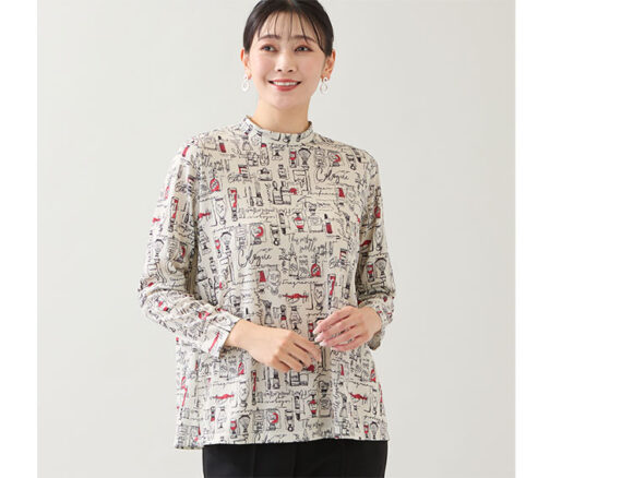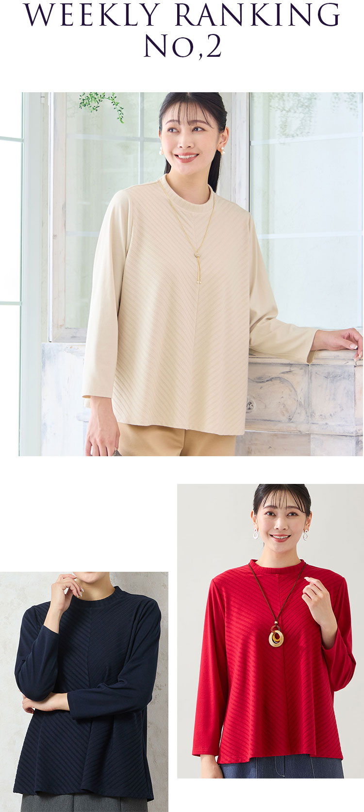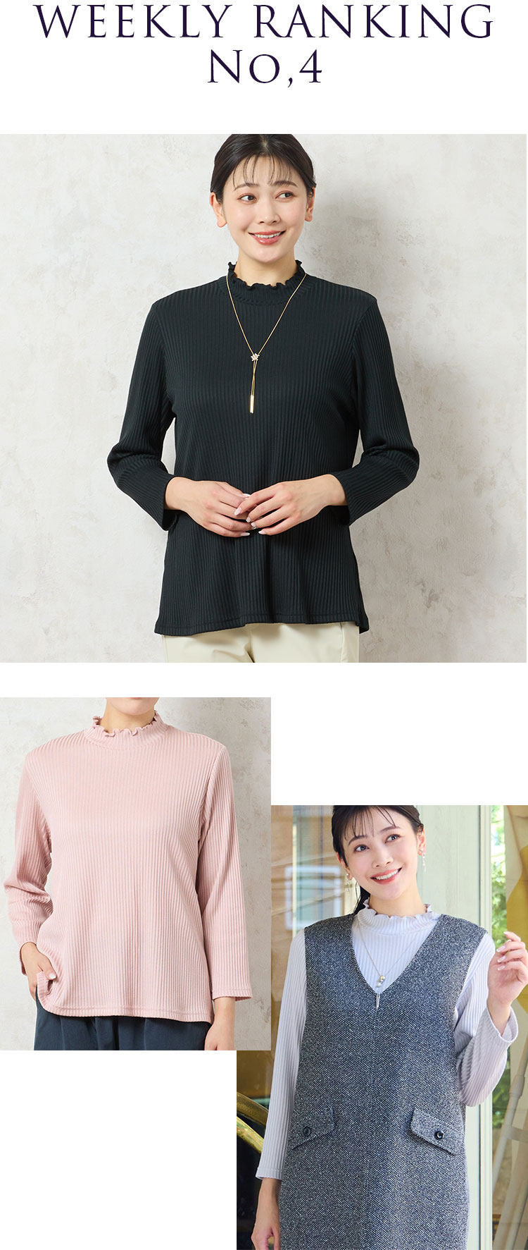 ベーシックで着まわせる綿混のカットソーが人気No.4!シルクのような艶感が特徴で、襟端のフリルが大人可愛いアイテム。重ね着でロングシーズン着られる優秀アイテムです。