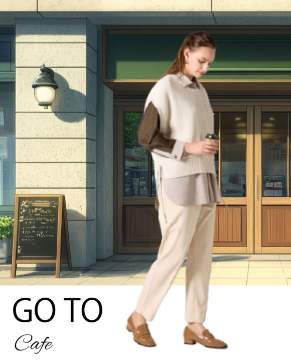 ナチュラルな色合わせの中にも洗練された雰囲気のあるベージュトーンのレイヤード。